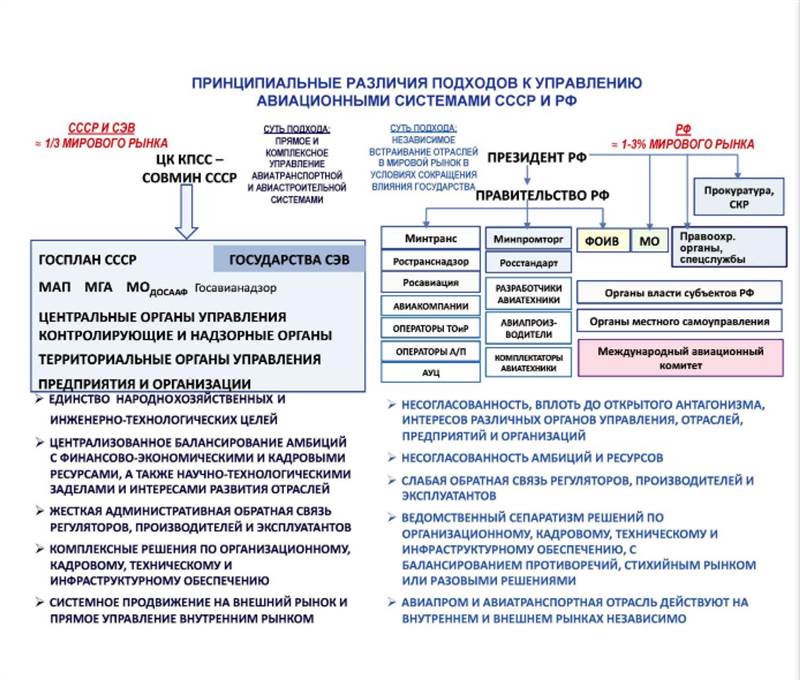 Как отмечалось выше, в советской системе управления авиацией чётко разделялись функции постановки задачи на создание авиатехники, осущестляемые высшим партийным и государственным руководством, созданию авиатехники, осуществляемые в системе МАП СССР, и эксплуатации летательных аппаратов в системе МО СССР, МГА СССР и т.п. Окончательные решения по ключевым вопросам постановки задачи, концентрации ресурсов на её выполнении и оценки полученных результатов принимались на уровне ЦК КПСС и Совета Министров СССР. После ликвидации партийных и союзных органов управления и проведения рыночных реформ количество субъектов управления авиационной системой резко возросло.