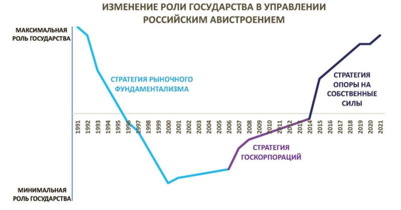 В период с 1991 г. по 2000 г. роль государства в управлении системой авиапрома сократилась с практического полного контроля всех организаций до управления миноритарными пакетами акций и распределения относительно незначительных средств на НИОКР и заказ серийной авиатехники (преимущественно военного назначения).Даже в тех случаях, когда заводы и КБ не акционировались и были формально подконтрольны государству, управление ими со стороны органов власти преимущественно сводилось к назначению единоличного исполнительного органа. Предприятия получили значительную свободу по организации международного сотрудничества. Существовало ожидание, что организации, выжившие на рынке, станут глобальными компаниями либо частями других глобальных компаний.