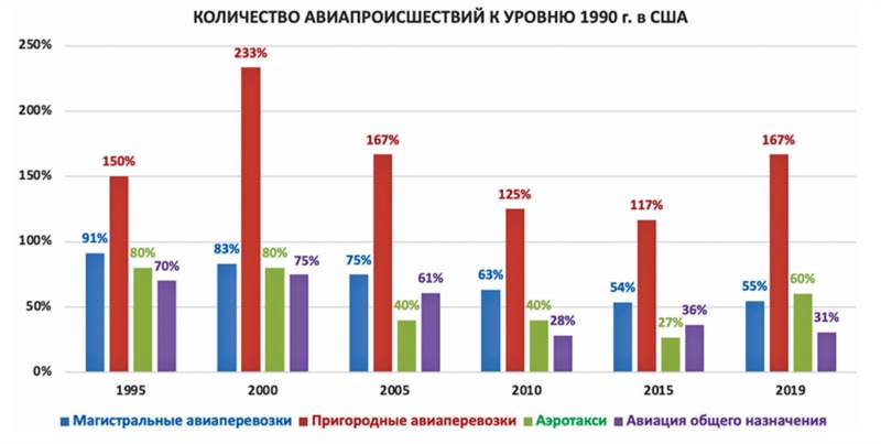 Что касается отдельных видов воздушных судов и типов авиаперевозок и авиаработ, то всё не так однозначно. Например, в США, при общем снижении количества авиапроисшествий позитивная статистика обеспечивается не во всех сегментах авиаперевозок. Например, пригородные авиаперевозки отличаются относительно плохой динамикой600 (рисунок 6.24).