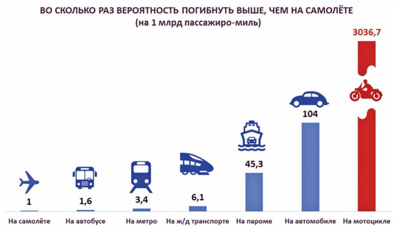 При выполнении авиационных перевозок и авиационных работ в Опытном районе неизбежно сохранится отличная от нуля вероятность авиационных происшествий и инцидентов. Помимо контроля рисков и борьбы за снижение вероятности негативных авиационных событий, необходимо информировать потенциальных заказчиков о существующих рисках, равно как и о том, что в экспериментальной авиации они заведомо выше, чем в коммерческой. Исходя из добросовестного информирования о рисках потенциальный пассажир сможет самостоятельно принять решение о своей готовности или неготовности разделять эти риски. Данный подход методологически схож с подходом, при котором разрешается эксплуатация мотоциклов и даже перевозка на них пассажиров, несмотря на риски, перекрывающие риски любых полётов гражданской, государственной и экспериментальной авиации, за исключением полётов, связанных с участием в воздушном бою, и полётов при обстреле средствами ПВО (рисунок 6.26).