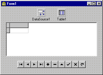 Для создания простейшей программы понадобится одна форма, не визуальные компоненты «DataSource» и «Table» из вкладки «Data Access», и визуальные компоненты «DBGrid» и «DBGrid» из вкладки «Data Controls». Расположите компоненты на форме как показано на рис.1.