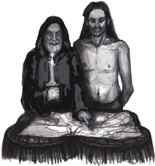 Тем временем лёгкий скрежет и тихие шаги доносились из гущи деревьев. Аккуратные медленные шажочки, будто кто-то шёл в последний путь. Среди деревьев показался силуэт неизвестного человека, другого человека. Одетый в наряд странника, напоминавший одежду бедняков, шёл ещё один мужчина. Удивительно, но в такой чаще, неизвестно в какой бездне этого мира, этот человек как раз наткнулся на безымянного воина. Когда путник подошёл к нему, тот просто смотрел на него, но ничего не мог сказать. Странник тоже молчал и лишь смотрел павшему в глаза. Через мгновение стоявший человек крикнул: