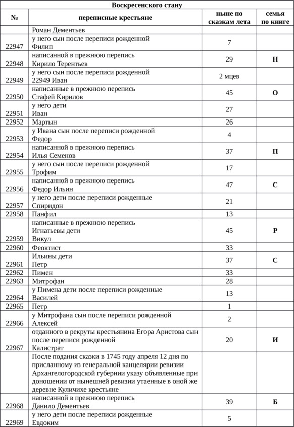 Так случилось и с семьей Данило Дементьева, – «после подания сказки в 1745 году апреля 12 дня по присланному из генеральной канцелярии ревизии Архангелогородской губернии указу объявленные при доношении от нынешней ревизии утаенные в оной же деревне Куличихе крестьянин (22968) написанной в прежнюю перепись Данило Дементьев 39 лет; у него дети после переписи рожденные (22969) Евдоким 5 лет и (22970) Егор 4 лет».