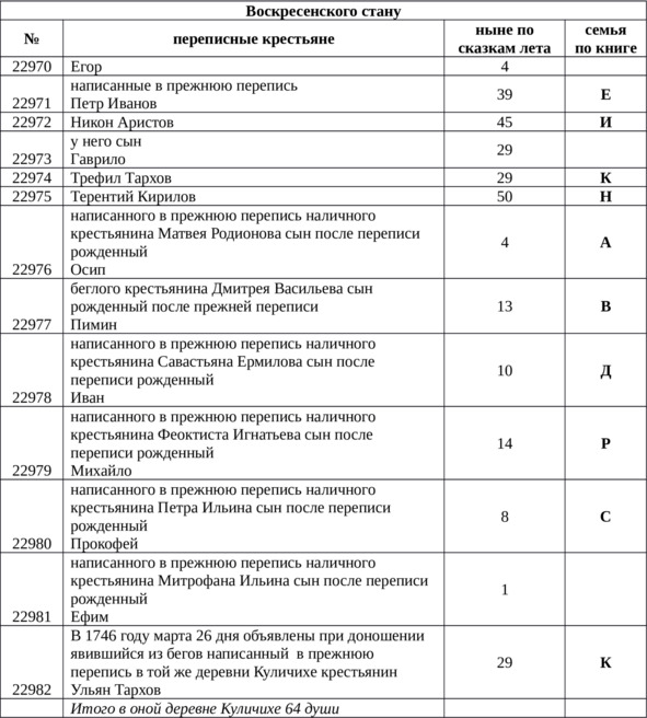 Далее, по главам описываются изменения, произошедшие в этот период в каждой отдельной крестьянской семье, и приведен состав семей, проживающих в деревне Куличиха в 1744 году.