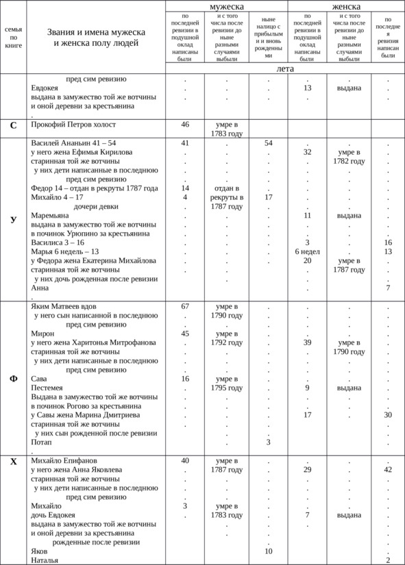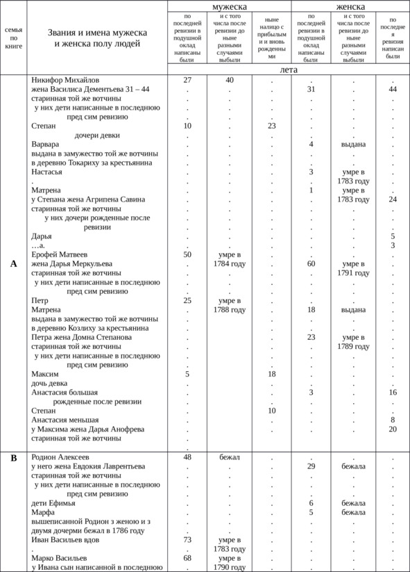 Итого в оной деревне Куличихе крестьян мужского пола всего – 78, выбыло после 4-й ревизии – 36, женского пола – 87, выбыло – 57, всего 165 душ.