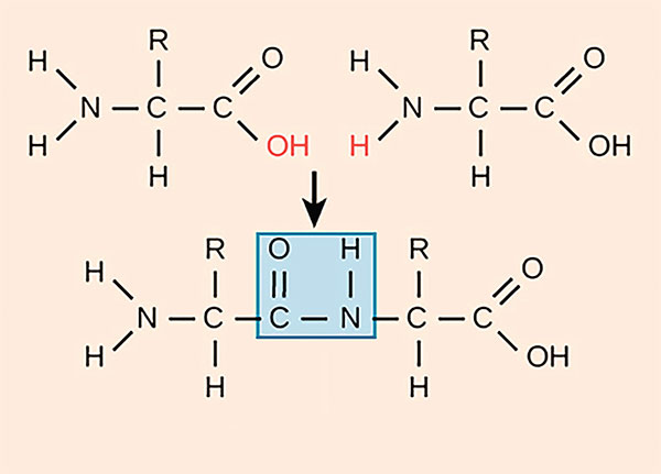 От одной аминокислоты с конца COOH (карбоксила) отщепляется – OH, а от конца с NH2 (аминогруппы) – другой – H, из них образуется вода (H-O-H, или хорошо знакомая всем H2O). Освободившиеся при этом электроны образуют ковалентную связь между C и N. Ковалентную связь между двумя аминокислотами принято называть пептидной[32].