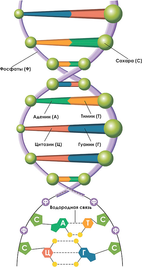 Каждый нуклеотид состоит из одинакового для всех связующего звена, состоящего из сахара и остатка фосфорной кислоты, и одного из четырех разных кодирующих элементов: аденина, гуанина, тимина или цитозина. Связующие элементы создают между собой прочные ковалентные связи (азот – углерод), вместе образующие спираль, напоминающую штопор. Кодирующие элементы связываются друг с другом водородными связями: аденин с тимином двумя водородными связями, а гуанин и цитозин – тремя. Через мостики кодирующих элементов две спирали ДНК связываются, образуя двойную спираль с перемычками, напоминающую лесенку (рис. 1.2.4).