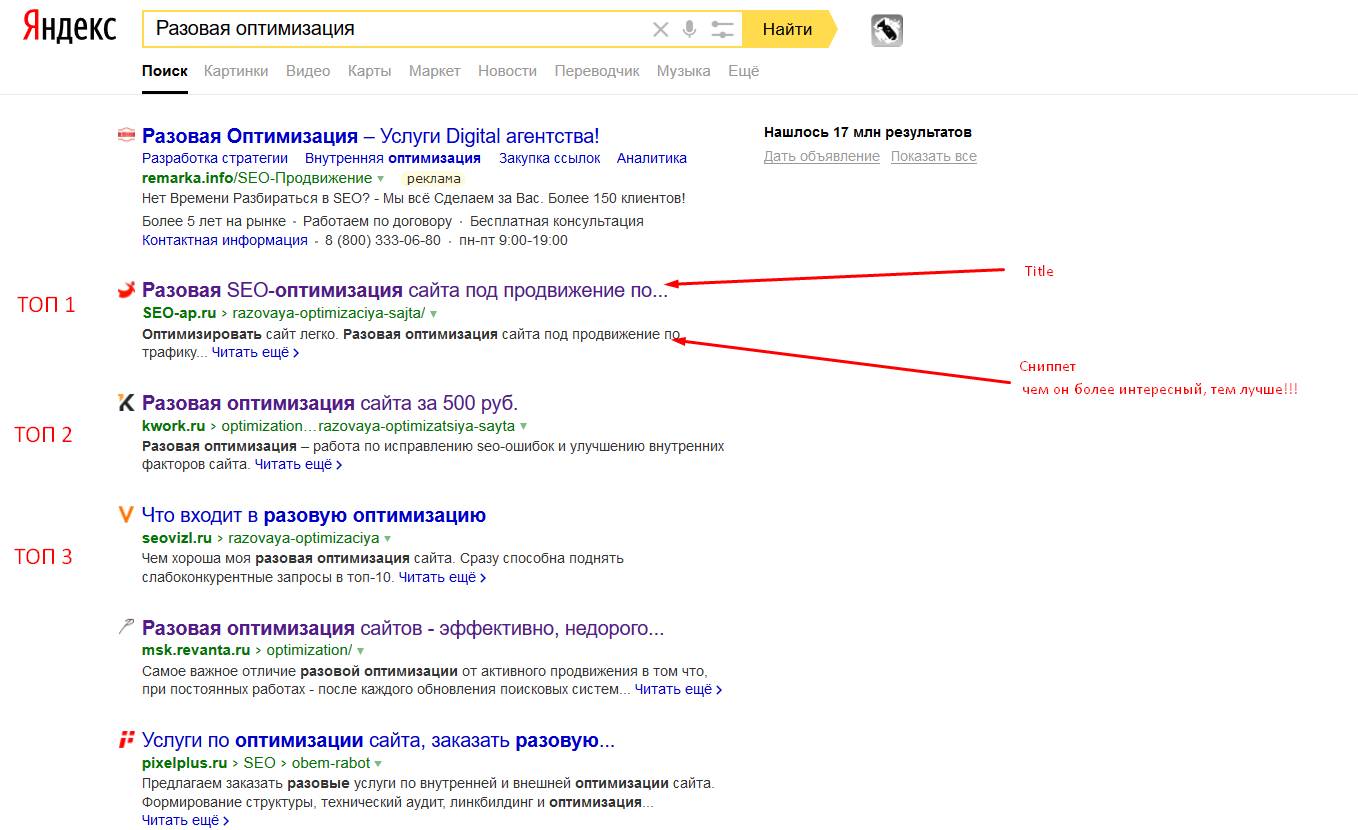 .Cниппет – описание сайта в поисковой выдаче. В данный момент формируется автоматически поисковой системой. При формировании используются контент страницы и пользовательский опыт.