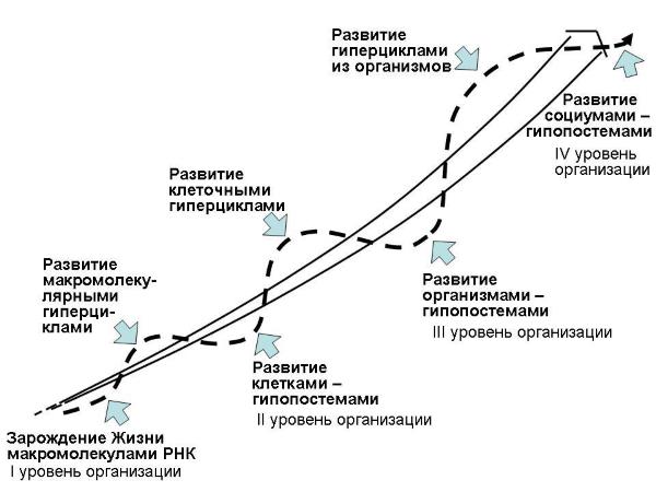 Рисунок 1.1.1.: Биологическая эволюция по уровням организации с переходом от гиперциклов к гипопостемам: