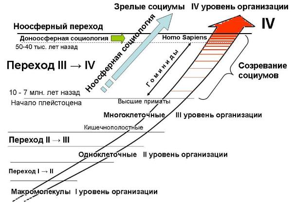 Обрати внимание, Читатель: в доноосферной социологии доноосферный Социолог охватывает исторический период всего примерно 50–40 тысяч лет. То есть со времени возникновения [зрелого] Homo Sapiens^ по настоящее время.[3] Тем, что происходило за этими границами, доноосферный Социолог не занимается. В доноосферной науке это – епархия доноосферного Антрополога. А о том, что впереди, за предвосхищаемым переходом к ноосфере, доноосферные Социологи догадываются более чем смутно. Что же касается ноосферных Социологов, то они охватывают весь период становления IV уровня организации Жизни. Начиная с той эволюционной ступени, когда развитие пошло от высших приматов ещё дальше вверх, до ноосферного транскультурного перехода и далее, ЗА переход, на самом IV уровне организации Жизни. То есть отслеживают как самое начальное созревание социумов (захватывая антропологию), так и дальнейшее их зрелое развитие после ноосферного транскультурного перехода.