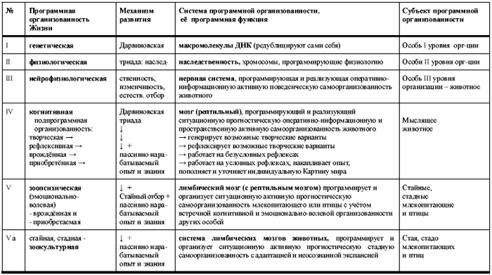 За период развития лимбического мозга произошло постепенное уровнево-коэволюционное нарастание V и Va программных организованностей – индивидуальных и стайной. Индивидуальная V программная организованность есть единичная копия Va, стайной программной организованности. Соответственно Va, стайная программная организованность есть совокупность копий V, индивидуальных программных организованностей. Дарвиновская положительная обратная связь генерирует удачные индивидуальности, а через их постепенное накопление происходит нарастание возможностей и зоокультуры конкретного биологического вида.