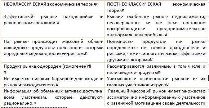 Для постнеоклассики характерно расширение теории оценки, с одной стороны, позволяющее описывать на основе так называемых «поведенческих финансов» и их приложений – поведение внутренне неравновесных маятникообразных массовых рынков в условиях неопределенности. С другой стороны, позволяет рассматривать ценообразование неликвидных активов, т.е. ценообразование на рынках массовых активов, обмениваемых в рамках индивидуализированных двусторонних сделок.