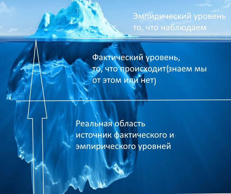 В отличие от позитивизма критический реализм учит нас обращать внимание не только на эмпирический уровень, то есть на наблюдаемое нами события, но и смотреть глубже в область фактический и реальный области, где формируются основы эмпирического уровня.