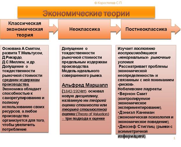 В заключении этой главы следует отметить, что экономисты выделяют три экономические теории, которые оказывают существенное влияние на процесс экономических измерений: классическая экономическая теория, неоклассика и постнеоклассика (рис.2.7)