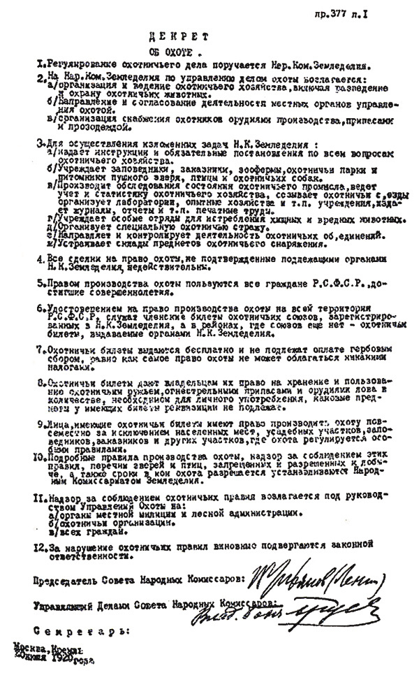 Декрет об охоте, 1920 г. [Государственный архив Российской Федерации]