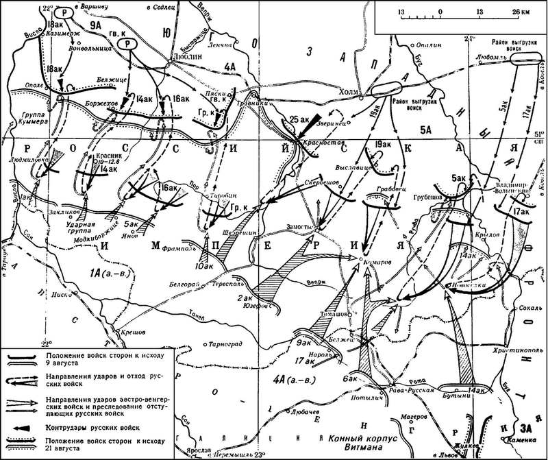 Успех армии Данкля на северном фланге сражения побудил Конрада отдать на 26 августа приказ об общем наступлении. Первая армия ориентировалась на Люблин, 5-я – на Холм, группа Иосифа-Фердинанда – на Грубешов. Третьей армии при содействии второй, которая должна была охватить южный фланг Рузского, ставилась задача отбросить противника на линию Броды-Тарнополь или хотя бы задержать его движение.