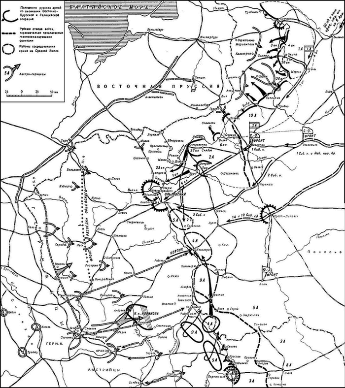 КОНТРНАСТУПЛЕНИЕ СЕВЕРНОЙ ГРУППЫ 2–9 СЕНТЯБРЯПосле катастрофы 2-й армии в Восточной Пруссии русские войска, сосредоточенные на северном фланге Галицийской битвы, были обязаны наступать. Альтернатива была одна, и она даже была обозначена в официальном документе: случае безусловной невозможности в течение ближайших дней достигнуть решительных над австрийцами успехов, будет указано армиям Юго-Зап. фронта постепенно отходить на р. Зап. Буг с общим направлением Дрогичин – Брест-Литовск – Кобрин». То есть речь шла об оставлении Варшавы и всего польского ТВД; такой отход, без сомнения, индуктивно привел бы и к отступлению из Галиции.
