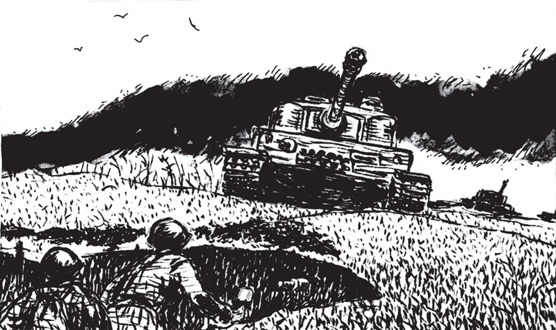 Слева и справа идёт сражение. Не пропускают герои танки.