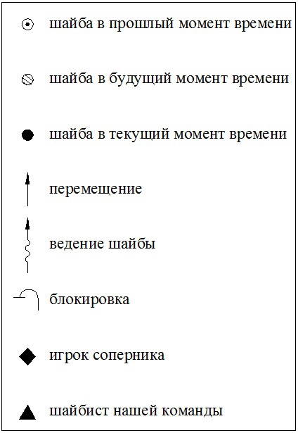 На чертежах полное закрашивание соответствует начальному моменту времени, штриховка – будущему. Линии, оканчивающиеся стрелками обозначают движение игроков и шайбы; движение с волнистой линией обозначает ведение шайбы.