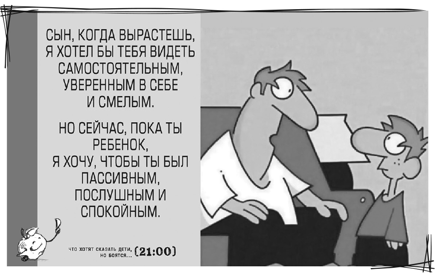 Однажды в аэропорту я стал свидетелем одной удручающей воспитательной сцены, которую самое время сейчас упомянуть в качестве иллюстрации темы. За столиком в кафе завтракала мама и ее дочка. Точнее будет сказать мама завтракала, а дочка подвергалась перманентной обструкции. За две (!) минуты я насчитал девятнадцать… ДЕВЯТНАДЦАТЬ!!!… одергиваний и замечаний, которые сердобольная (конечно же, в глубине души желающая исключительно добра) мамочка сделала своей дочке. Не вертись. Сядь ровно. Пододвинь тарелку. Отодвинь стакан. Прольешь. Положи руку так…