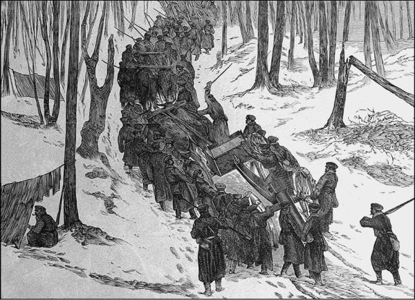 Через час упряжка снова застряла на крутом склоне. Тут уже работали в две смены: одни отдыхали, другие работали. Все от сапог до башлыка представляло одно сплошное грязное пятно, на фоне которого лихорадочно блестели солдатские глаза под серой коркой грязи и снега. Помимо пушек лейб-гвардейцы еще тащили на себе снаряды, ружья, манерки с патронами и задки для зарядных ящиков. Провизию оставили в долине. Так вот и шли. Хорошо еще, турки из-за непогоды попрятались в свои крысиные норы, не шкодили. На половине подъема пришлось заночевать. Для штабных офицеров подыскали хорошее место – не продуваемое на ветру, под холмом, за правым флагом полка, где и была разбита их палатка. Солдаты же остались ночевать прямо на дороге.