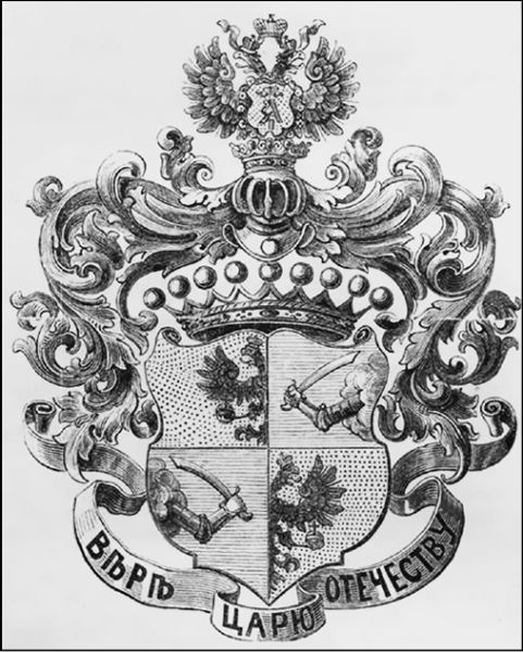 Сам герб представлял собой щит, разделенный перпендикулярно на две части. В правой – золотой – виден вылетающий наполовину черный орел в короне, имеющий в лапе державу. В левой половине, на лазоревом фоне, из облаков выходит рука в латах, держащая меч. Держава и рука с мечом во все времена воплощали в геральдике отвагу и готовность защищать свою Родину. В 1877 году к гербу добавилась графская корона и графский коронованный шлем. Таким образом император Александр II отблагодарил своего верного служаку Павла Игнатьева, возведя его со всем нисходящим потомством, к которому принадлежал и мой герой, появившийся на свет холодным январским днем 1832 года, «в графское Российской империи достоинство».