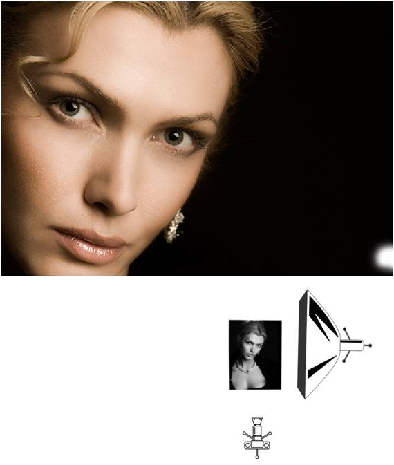 Это классический портрет с одним источником света. Выбран большой софтбокс для более мягкого освещения модели. Источник света максимально приближен к лицу портретируемой. Это позволило получить пластичные тени и хороший объем.