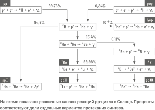 Но чаще идут другие реакции. В 84,6 % случаев два ядра гелия-3 взаимодействуют друг с другом, порождая ядро 4He и два протона. В оставшихся 15,4 % начинается другая цепочка реакций: гелий-3 взаимодействует с гелием-4, образуя ядро бериллия-7 (7Be) и испуская гамма-квант. Однако бериллий не является конечным продуктом, он вступает в реакцию или с электроном (99,89 % случаев), порождая литий-7 (7Li) и электронное нейтрино, или с протоном (0,11 %), порождая бор-8 (8B) и гамма-квант. В свою очередь литий-7 захватывает протон и распадается на две альфа-частицы, а бор-8 превращается в возбужденное ядро бериллия-8 с испусканием позитрона и электронного нейтрино (это так называемые борные нейтрино, из всех рождающихся в Солнце в заметном количестве они имеют наибольшую энергию). И, наконец, ядро бериллия распадается на две альфа-частицы.
