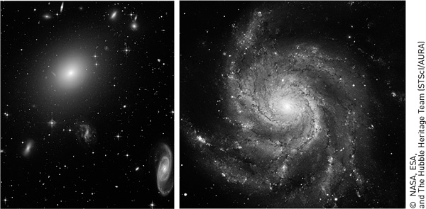 Фотографии эллиптической и дисковой галактик. Эллиптическая галактика ESO 325-G004 входит в состав скопления Abell S0740 (вокруг видно много других галактик разных типов). А дисковая – известный объект каталога Мессье, М101. В эллиптической газ уже практически закончился и процесс звездообразования очень слаб. Ярких массивных звезд, дающих голубоватый свет, там практически нет. В дисковых галактиках газа еще много, и красивый спиральный узор образован в основном яркими молодыми массивными звездами, которые сформировались менее нескольких десятков миллионов лет назад.