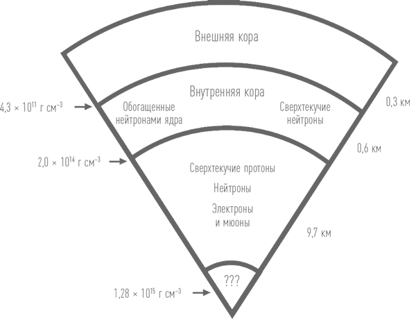 Внутреннее строение нейтронной звезды. Выделяют две основные части: ядро и кору. Каждую из них, в свою очередь, также делят надвое. Во внутренней коре появляются свободные нейтроны в сверхтекучем состоянии. А поведение вещества во внутреннем ядре вообще остается загадкой.