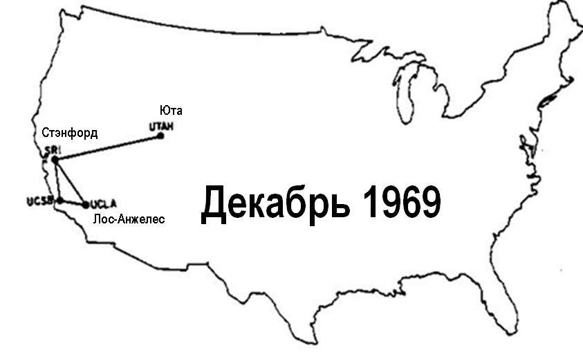 Появление цифровой среды началось с идеи обеспечения более развитого хранения и использования данных посредством объединения компьютеров в сеть, описанной в статье "Симбиоз человека и компьютера" 1960 г. Джозефом Ликлайдером. В октябре 1967 г., спустя пять лет после Карибского кризиса, как часть проекта по осуществлению мер противодействия ядерной угрозе (а именно созданию беспрерывных информационных потоков для управления армией и страной) появился проект компьютерной сети ARPANET (Advanced Research Projects Agency Network). Нужно пояснить, что угроза ядерного апокалипсиса была явной и совершенно недвусмысленной ввиду размещения советских ракет на Кубе. Даже сейчас, когда минуло полвека событиям того времени, вызывает ужас просмотр американских учебных фильмов, где детям в случае визуального обнаружения гриба ядерного взрыва, рекомендовалось буквально "надеть противогаз и лечь под парту". Согласно тексту документа от 24 марта 1969 года «RFC под номером 4» [3] представляющему собой не столько «запрос комментария», сколько расписание запуска сети, первый тестовый обмен информацией был произведён 15 октября 1969 года между Калифорнийским Университетом Лос-Анжелеса и Исследовательским Институтом Стэнфорда. Первая сеть заработала в декабре 1969 г. и объединила 4 компьютера (рис. 1). Основной принцип соединения отдельных физических сетей, не связывая сетевые ресурсы постоянными каналами с помощью коммутации пакетов, используется и в наше время для работы глобальной сети Интернет.