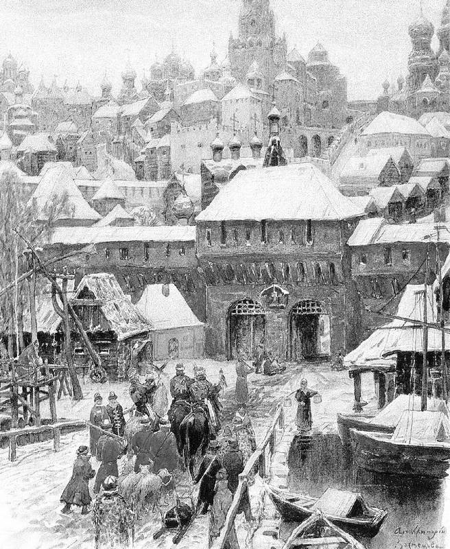 В 1461 г. у Боровицких ворот построили каменную церковь Рождества Иоанна Предтечи вместо деревянной, о которой летописец записал, что «глаголют же, яко то пръваа церковь на Москве». Несколько позже случилось весьма знаменательное событие – летопись сообщила о том, что не князь, не боярин, не церковный иерарх, а купец возвел «кирпичные» палаты. В 1471 г. купец Таракан (надо думать, из богатых купцов Таракановых, имевших позднее дом в Китай-городе) построил у Фроловских (Спасских) ворот свой дом: «единого лета и сведе».