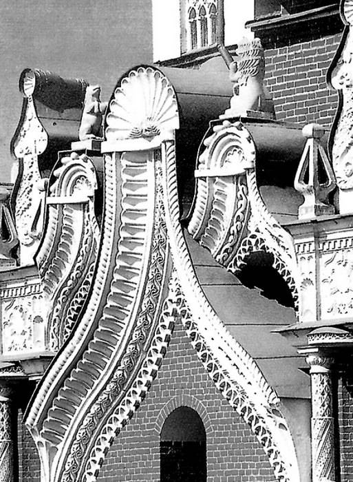 Эта башня первой получила декоративное завершение: в 1624–1625 гг. англичанин Кристофер Галлоуей и помогавшие ему Виллиам Граф и русский мастер Бажен Огурцов соорудили на ней сложную надстройку из высокого восьмерика и восьмигранного шатра. Спасская башня украсилась стрельчатой аркадой по верху четверика, большими иконными киотами, острыми вытянутыми пирамидками. Сочетание красного кирпича кладки и белокаменных деталей придало облику башни исключительную декоративность. Среди ее убора есть и белокаменные фигуры львов и медведей (ранее, еще до надстройки и до XVII в., на башне стояли скульптуры Василия Ермолина, из которых одна – святого Георгия – частично сохранилась и теперь находится в Третьяковской галерее), в нишах аркады были помещены изваяния обнаженных человеческих фигур, или, как называли их в Московии, «болванов», но для целомудренных москвичей это было совсем уж непривычно, и фигуры пришлось одевать в обычные тогда одежды – суконные кафтаны, на которые пошло «англинского сукна» разного цвета 12 аршинов. В пожар 1628 г. скульптуры попортились, их сняли и больше уже не восстанавливали.