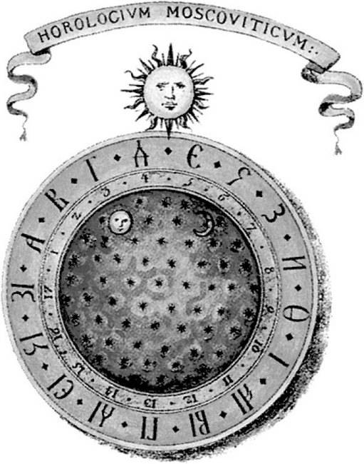 Это был огромный механизм с циферблатами диаметром свыше 5 м, выходящими на Красную площадь и в Кремль, на голубом фоне их сияли жестяные звезды и золоченые изображения луны и солнца. Окружность циферблата разделили на 17 часов, каждый из которых помечался славянской буквой – аз, буки, веди, глаголь и т. д. (буквы обозначали цифры), а также и арабской цифрой. Счет времени велся по дневному и ночному периоду – дневной счет начинался с первым лучом солнца, а ночной – с последним, и, соответственно, два раза в сутки часовщик переводил счет времени. В связи с этой немаловажной обязанностью можно привести выдержку из любопытного документа XVII столетия, в котором излагалась жалоба на вдову часового мастера Данилова Ульяну, которая заменила мужа. Часовщик соседней Троицкой башни Григорий Алексеев написал, что «вдова Улита бездетна и безродна и живет на той Спасской башне и часы держит она, вдова Улита, не уставно». А вот как именно «не уставно», часовщик объяснил так: «…по многие времена часы мешаютца. Перед отдачею часов дневных и нощных бывает у ней один час продлитца против дву часов, а в денное время бывает в одном часе два часа поскорит».
