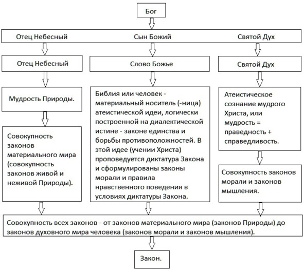 *«Бог» – это идея – учение Христа. Учение Христа – это завуалированная под религиозное откровение научно-материалистическая идея, в которой сформулированы все законы морали и правила нравственного поведения в условиях диктатуры Закона. Эта идея предельно логична, потому что поддаётся рациональному (логическому) научно-материалистическому объяснению.