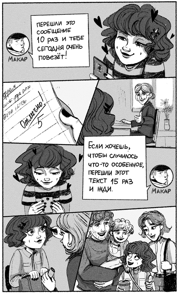Пока я завтракала и пыталась повторить даты по истории, Макар прислал стикеры с цветами. Я чуть не подавилась чаем, долго думала, что ответить. Но пока решалась, пришло ещё одно сообщение. Какой-то текст. Я всё боялась заглянуть. Пока бежала в школу, сердце колотилось где-то в голове. Уже в классе открыла, а там обычная дурацкая рассылка: „Перешли это сообщение 10 раз, и тебе сегодня очень повезёт“. И мне вдруг стало так весело. Я взяла и сразу переслала всем друзьям это сообщение».