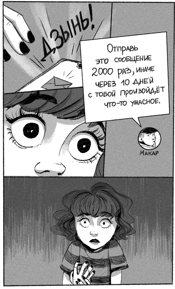 Через несколько дней под вечер, я как раз заканчивала убираться в зоомагазине, пришло сообщение. Я заглянула одним глазом – Макар. Тут же улыбка до ушей. Собрала тряпки и вёдра, помыла руки и только тогда заглянула. В сообщении было написано: „Отправь это сообщение 2000 раз, иначе через 10 дней с тобой произойдёт что-то ужасное“.