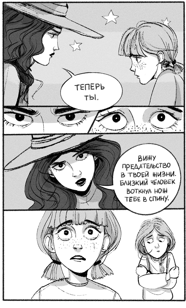 Сказала, что видит предательство в её жизни. Недавно близкий человек воткнул ей в спину нож. Вика аж позеленела на этих словах, а Соня носом захлюпала. Регина, чтобы её развеселить, напророчила хорошие оценки, неожиданное счастье и любовь великую лет через десять. Оценки и счастье, кстати, быстро сбылись, всё-таки есть у Регины какие-то способности.