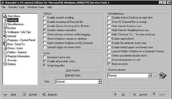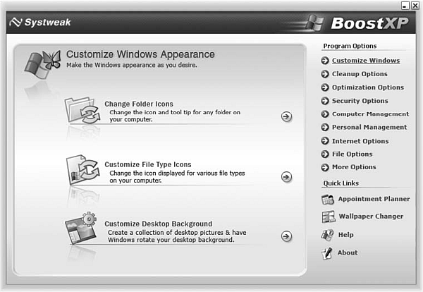 Настройки приложения разделены на две группы – Utilities и Tweaks. В категорию Utilities входят следующие утилиты: System Information (подробная информация о системе и установленном аппаратном обеспечении); Add/Remove Programs (корректная установка и удаление программ); Startup Manager (менеджер программ, запускающихся вместе с операционной системой); DLL Manager (менеджер используемых библиотек DLL); Disk Cleanup (очистка дискового пространства от временных и неиспользуемых файлов); OEM Information (информация о поставщике операционной системы); System Folders (утилита для изменения расположения системных папок); Cookie Management (управление файлами Сookies); Windows Tools (управление стандартными системными приложениями Windows). Группа Tweaks включает в себя настройки операционной системы, которые объединены в несколько групп: System (системные настройки, используя которые можно увеличить производительность Windows); Start Menu (удаление пунктов меню Пуск, а также управление прозрачностью Панели задач); Internet Explorer (настройки популярного браузера и интернет-соединения); Security (сетевые и системные настройки безопасности); Explorer/Desktop (настройка Рабочего стола и управление шрифтами); Miscellaneous (различные настройки, например можно установить изображение, которое будет появляться при загрузке операционной системы).