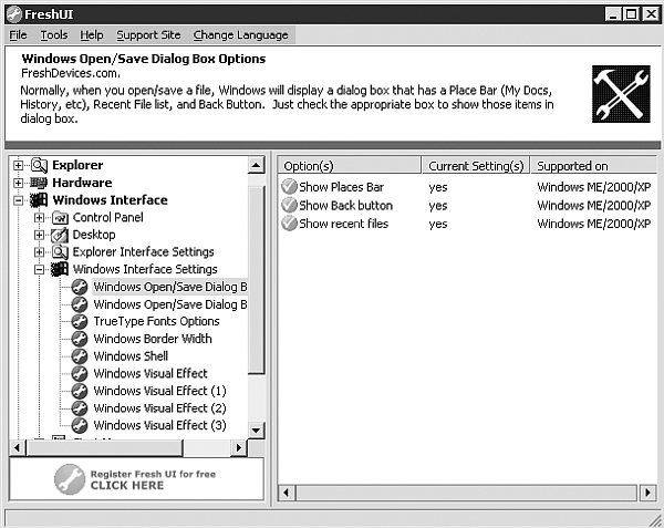 Программа FreshUI предназначена для конфигурирования и оптимизации работы операционной системы Windows. С ее помощью вы можете настроить интерфейс Windows, параметры системы и запуска различных приложений, а также изменить профили аппаратной конфигурации для различных пользователей. FreshUI позволяет изменить около 100 скрытых параметров и установок Windows. Средства их настройки содержатся в соответствующих разделах: Applications, Explorer, Hardware, Windows Interface и Windows System.