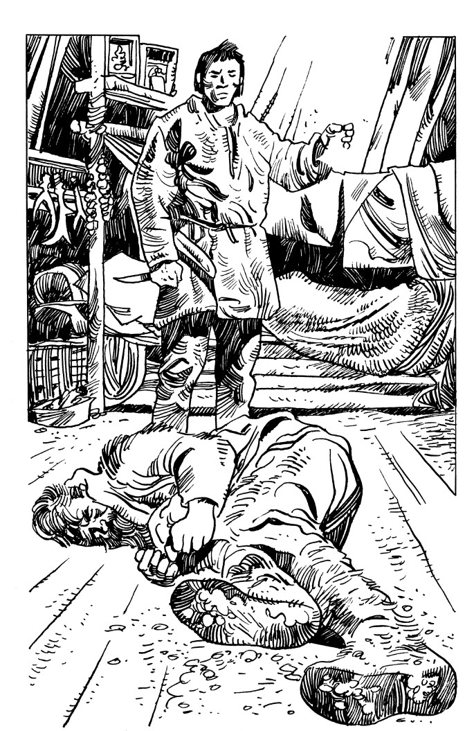 Охотник встал с покрытых медвежьими шкурами нар и подошёл к двери, на всякий случай прихватив со стола нож в меховых оленьих ножнах. Стук не прекращался и теперь стал более отчётливым. Тогда Ергач откинул крючок и открыл дверь. Что-то тёмное и бесформенное вторглось в избу и, словно куль с картошкой, рухнуло на пол. Сжимая извлечённый из чехла нож, хозяин опасливо отступил назад, к столу, и поспешно разжёг керосиновую лампу. Жёлтое пламя, тускло бьющее сквозь закопчённое стекло, высветило седого длиннобородого бродягу, распластанного на грязных досках. Незнакомец казался мертвецом, лишь слабое судорожное дыхание говорило о том, что в иссохшем одеревеневшем теле ещё теплится уголёк человеческой жизни. Ергач перенёс гостя на свои нары.