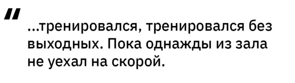 Очень приятные ощущения, когда в зале собираешь все блины, чувствуешь, как гриф гнется, максимальное напряжение всего тела… Хотел участвовать в юношеских соревнованиях по тяжелой атлетике. Готовил форму, сушился, изучал сплит-системы, питание. И тренировался, тренировался без выходных. Пока однажды из зала не уехал на скорой. Вызывали в тот день врачей три раза, никак не могли меня откачать. Делали уколы, а давление не спадало. Было плохо, не мог встать. Третья бригада увезла в больницу.