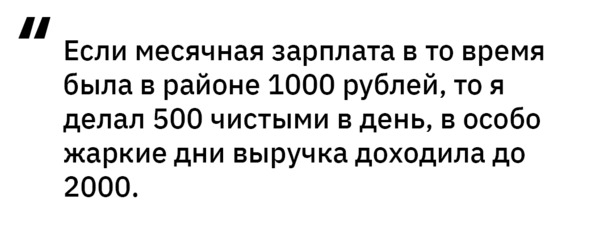 Зарабатывать получалось хорошо. Если месячная зарплата в то время была в районе тысячи рублей, то я делал пятьсот чистыми в день, в особо жаркие дни выручка доходила до двух тысяч. Три месяца я занимался мороженым, а жить на эти деньги спокойно мог до следующего лета, плюс стабильная выручка от газет. Мог. Но жил по-другому.