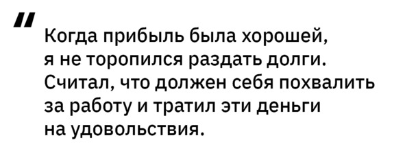 Когда прибыль была хорошей, я не торопился раздать долги. Считал, что должен себя похвалить за работу, и тратил эти деньги на удовольствия. «Бизнесмен я или нет? Если да, то должен жить красиво!» – примерно такие мысли мной двигали, когда оставлял очередную тысячу в ресторане.