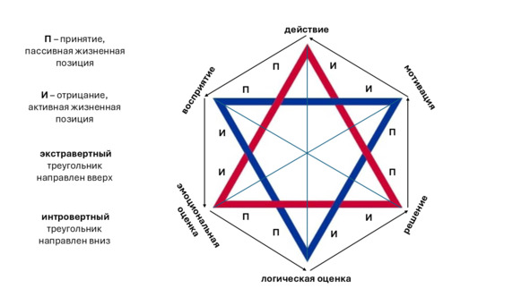 Интровертный треугольник включает в себя три ключевых элемента: восприятие, логическую оценку и мотивацию. В этом треугольнике восприятие играет центральную роль, и интроверт может сосредотачиваться на анализе и размышлениях, иногда в ущерб эмоциональной оценке.