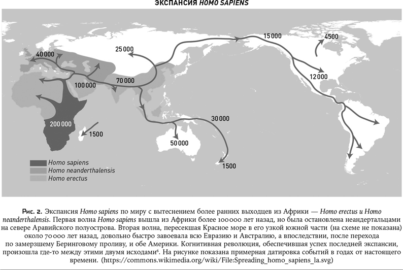 Древние люди доисторической эпохи использовали ресурсы дикой природы – жили охотой и собирательством. К какому-то моменту (около 70 000 лет назад) вид Homo sapiens накопил критическую массу изобретений, составивших первый технологический пакет человеческой цивилизации. Этот пакет (огонь, топоры, копья, дротики, лук со стрелами и т. д.) позволил людям занять нишу абсолютного хищника, довольно быстро покинуть Африку и расселиться по всему земному шару, уничтожив по пути другие, менее технологически развитые ветви рода Homo (см. рис. 2)[9].
