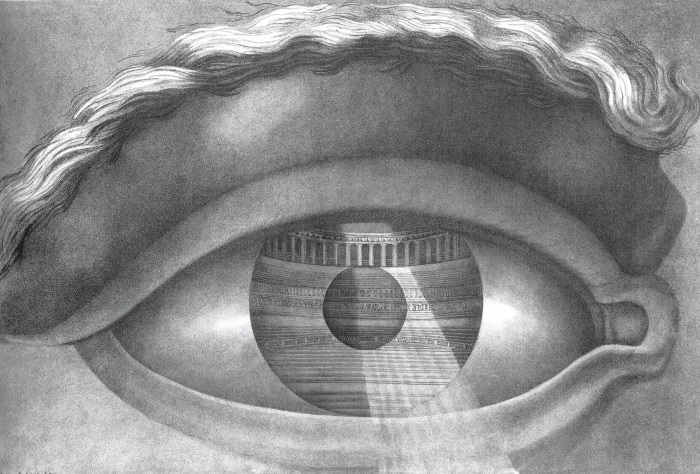 Иллюстрация К.-Н. Леду к проекту Театра в Безансоне (Ledoux C.-N. L’Architecture consideree sous le rapport de l’art, des moeurs et de la legislation. Paris, 1704. T. 1. Pl. 113) – позднее, исчезающее эхо античной проективной концепции зрения в европейской архитектурной мысли периода расцвета масонского движения. Свет, испускаемый глазом, – это свет Разума, который приходит из горнего мира и освещает (в первую очередь) пространство идеального зрительного зала, задуманного архитектором.