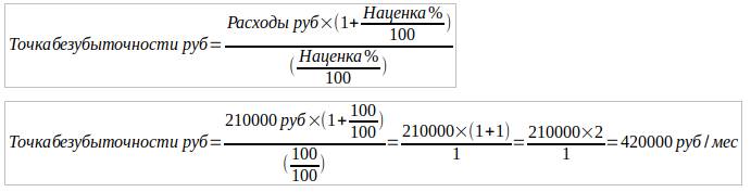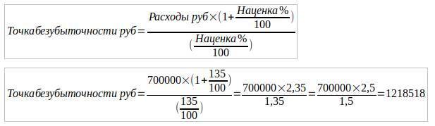 Главный показатель бизнес-плана. Он показывает насколько вы должны продавать, чтобы работать в прибыль. Рассчитывается он очень просто. Для его расчета вам потребуется знать расходы и наценку или маржинальность.