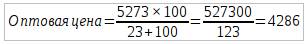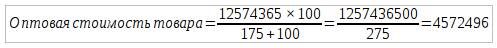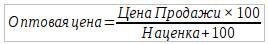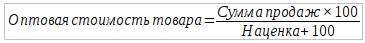 Оптовая стоимость товара = (Сумма продаж*100)/(наценка% + 100)