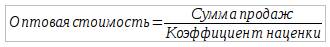 Оптовая стоимость = Сумма продаж/Коэффициент наценки